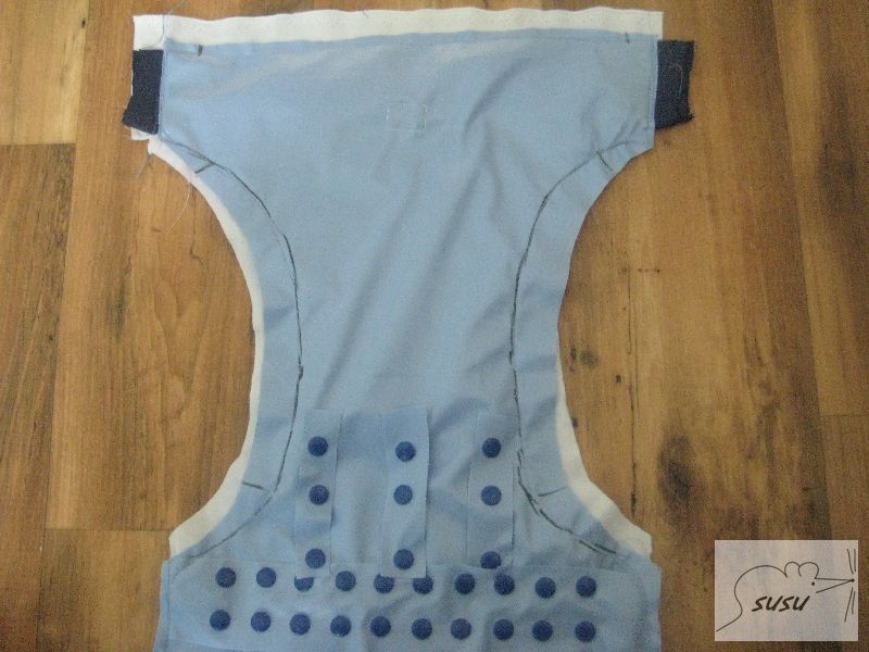3. Vyznačte si půlku, vzdálenosti patentek a napatentujte zmenšovací patentky. Já dávám rozteč 5,5 cm. tj. střed a 5,5 obě do boku. Vzdálenost od bříška - 8, 11, 13 (nebo 8, 11,5 a 14). Patentky podložte kouskem pulu, suede a nebo flísem. Jinak se budou vytrhávat.